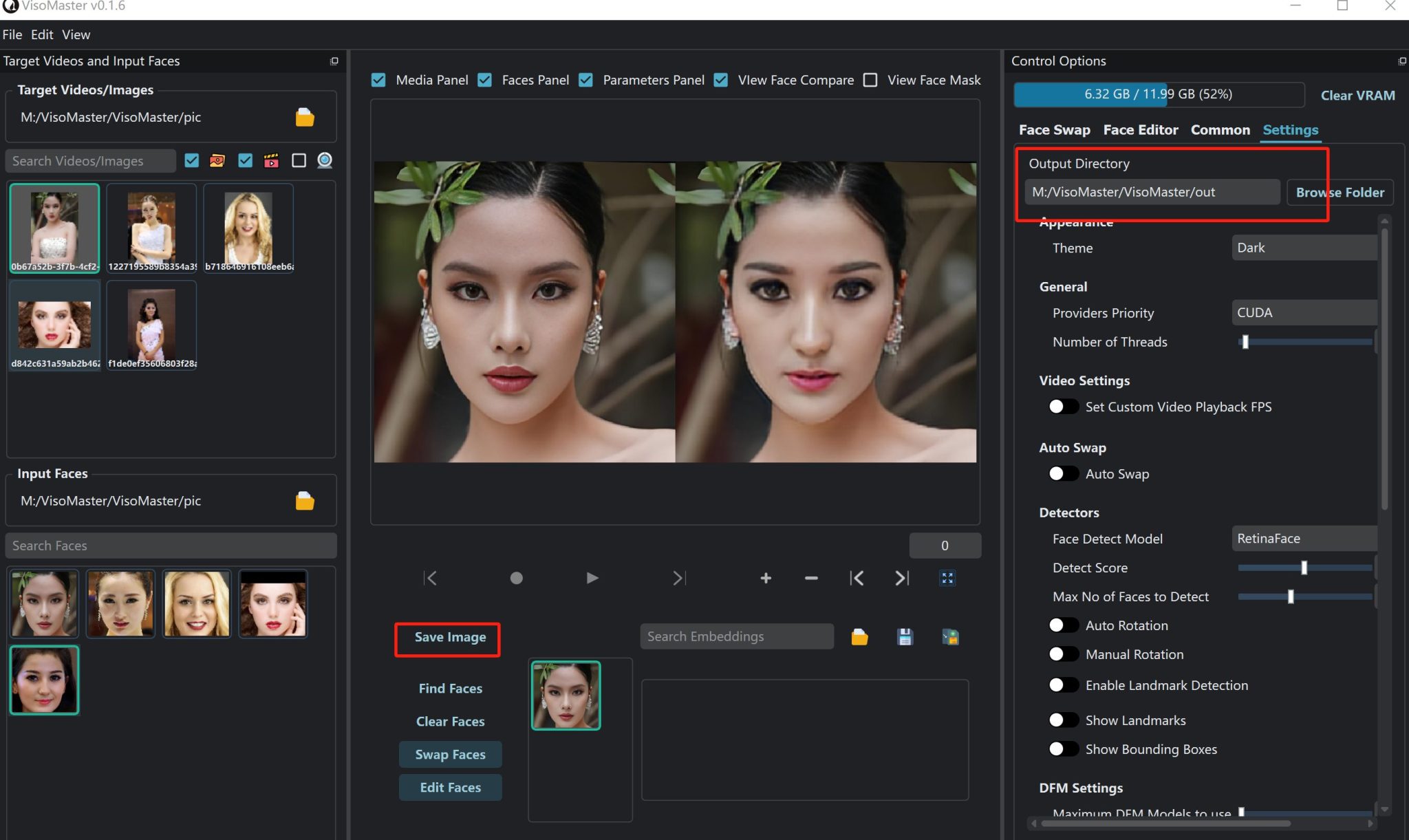 - 通过右侧面板调整处理参数,如人脸检测模式、换脸效果强度等。