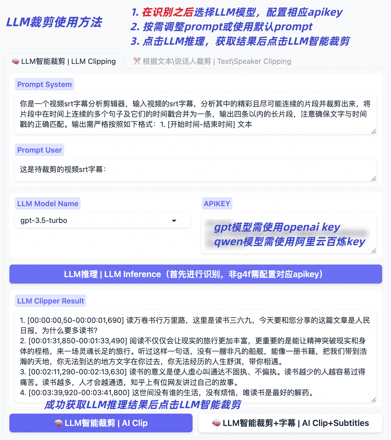- 全自动字幕生成:剪辑完成后,系统自动生成 SRT 字幕文件,覆盖全片及裁剪段落,告别手动添加烦恼