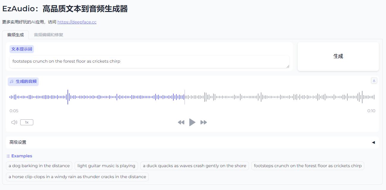 音频创作新纪元!EzAudio 高质量、超逼真音频生成神器 还在忍受千篇一律的机械合成音?还在为寻找适配音频素材而耗费大量时间?约翰霍普金斯大学与腾讯 AI 实验室联合研发的 EzAudio 震撼登场,以颠覆性技术实现 “20 字生成完美音频”,彻底改写文本转音频的创作规则! 三大核心优势,重塑音频生成标准 闪电级生成速度:创新优化模型架构,大幅降低计算资源消耗,实现音频快速输出,让创意无需等待 电影级音质体验:告别生硬机械感,生成音频兼具高保真音质与细腻情感表达,带来沉浸式听觉享受 高效数据训练体系:结合无标注与人工标注数据训练,在保障性能的同时,实现训练效率的飞跃提升 七大应用场景,解锁无限创作可能 智能语音合成:支持标准音、方言、趣味声线等多样化语音生成,为虚拟助手注入鲜活灵魂 音乐创作神器:输入风格与情感关键词,即刻生成专属旋律,激发音乐创作灵感 影视后期利器:快速生成逼真音效与专业配音,提升作品感染力 有声内容生产:自动生成有声读物、播客内容,大幅提升内容产出效率 音频编辑简化:零基础友好的操作界面,让复杂音频编辑变得轻松简单 教育内容制作:生成清晰生动的教学音频,助力知识传播 广告营销创新:定制个性化广告语音,增强品牌传播效果 芒果 AI 一键启动方案 为降低使用门槛,芒果 AI 团队精心打造本地化部署方案: 系统要求 操作系统:Windows 10/11 64 位 显卡:英伟达显卡(8G 显存以上) 计算平台:CUDA >= 12.1 使用步骤 获取资源:下载获取压缩包 解压运行:将文件解压至纯英文路径,双击 “EzAudio.exe” 启动程序 开启创作:系统自动打开浏览器操作界面,输入文字指令,即刻开启音频创作之旅 从内容创作者、音频制作人到普通用户,EzAudio 以强大功能与便捷体验,成为音频领域的全能工具。芒果 AI 提供的一站式解决方案,让每个人都能轻松掌握前沿技术,立即体验,见证文字与声音碰撞的奇妙瞬间! 声明:本站所有文章,如无特殊说明或标注,均为本站原创发布。任何个人或组织,在未征得本站同意时,禁止复制、盗用、采集、发布本站内容到任何网站、书籍等各类媒体平台。如若本站内容侵犯了原著者的合法权益,可联系我们进行处理。