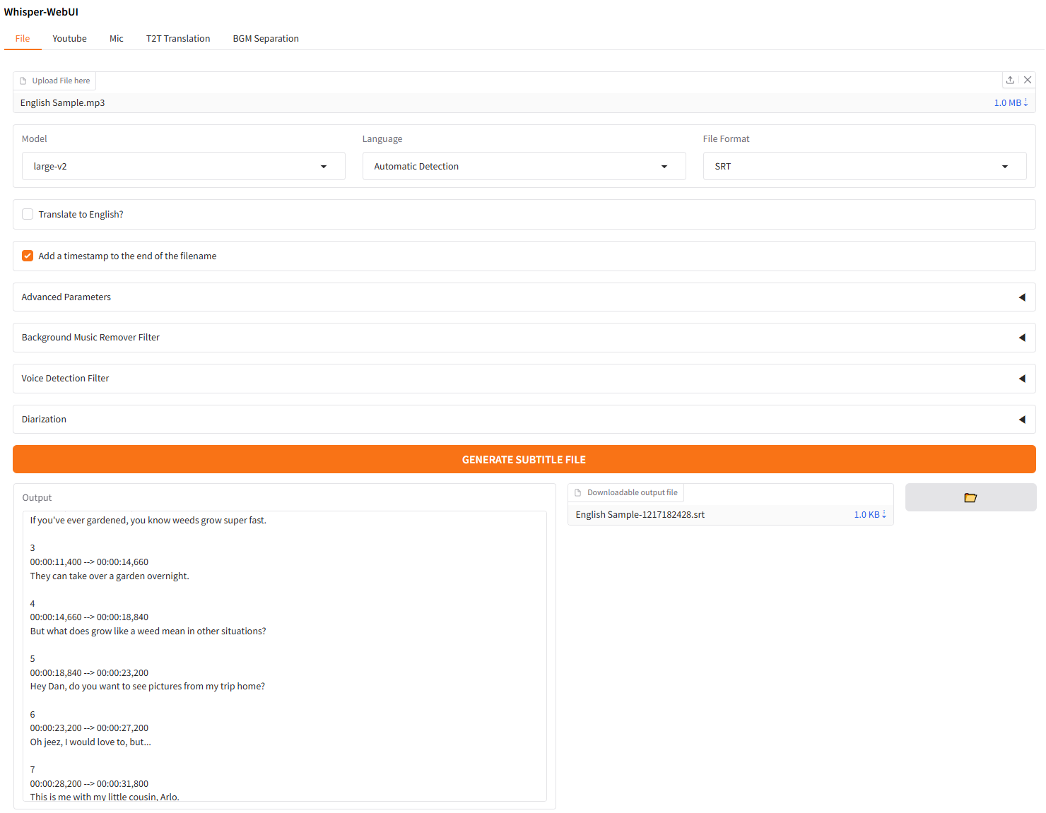 一键生成字幕与翻译!Whisper-WebUI 整合包助力音视频创作 还在为音视频字幕制作和跨语言翻译而烦恼?Whisper-WebUI 整合包重磅来袭!基于强大的 Whisper 模型,结合 Gradio 交互界面,打造一站式语音识别、字幕生成与翻译解决方案,让创作者轻松跨越语言与技术壁垒! 六大核心功能,满足全场景需求 多源字幕生成:支持音视频文件本地上传、YouTube 链接解析、麦克风实时收音三种模式,自动识别语音内容生成精准字幕 多格式输出:提供 SRT、WebVTT 专业字幕格式,以及 txt 纯文本格式(无时间线),适配不同编辑场景 语音翻译黑科技:利用 Whisper 端到端能力,直接将外语语音翻译成英语,无需复杂中间步骤 文本智能翻译:集成 Facebook NLLB 模型,支持字幕文件一键翻译,轻松实现跨语言内容传播 高效性能优化:内置 faster-whisper 加速方案,相比原版模型,转录速度提升 5 倍,显存占用直降 60% 灵活模型选择:提供 tiny 到 large 全系列 Whisper 模型,适配从低配置设备到高端显卡的不同硬件环境 芒果 AI 平台一键部署方案 为降低使用门槛,芒果 AI 团队精心优化整合包,提供极简操作流程: 系统要求 操作系统:Windows 10/11 显卡:建议根据模型需求配置(tiny 模型仅需 1GB 显存,large 模型需 10GB) 使用步骤 获取资源:下载压缩包 解压启动:将文件解压至纯英文路径,双击”Whisper-WebUI.exe “文件 开启创作: 浏览器访问http://127.0.0.1:7860/,选择音视频来源 配置字幕格式、翻译语言及模型参数 点击生成,静候字幕与翻译结果一键完成! 从短视频创作到外语课程制作,从直播实时字幕到跨国会议翻译,Whisper-WebUI 以强大功能与便捷体验,成为内容创作者的必备神器。立即前往芒果 AI 平台下载体验,让每一段声音都清晰可 “读”! 声明:本站所有文章,如无特殊说明或标注,均为本站原创发布。任何个人或组织,在未征得本站同意时,禁止复制、盗用、采集、发布本站内容到任何网站、书籍等各类媒体平台。如若本站内容侵犯了原著者的合法权益,可联系我们进行处理。