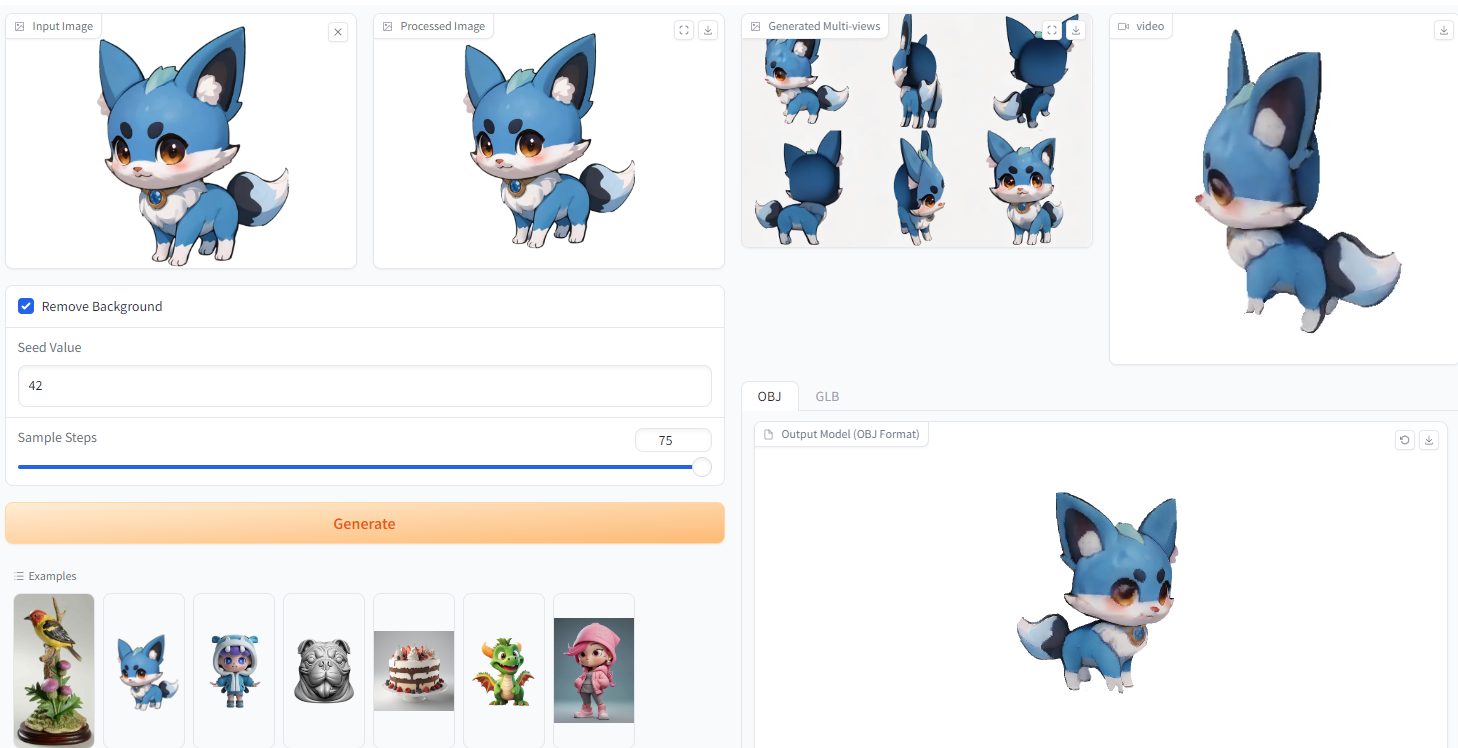 - 便捷命令行操作:配备简洁易用的命令行工具,不仅支持常规的 3D 网格生成,还集成视频保存、前景分割(借助 rembg 库)、模型导出(含顶点颜色的.obj 网格及带纹理映射模型)等丰富功能,操作更加高效