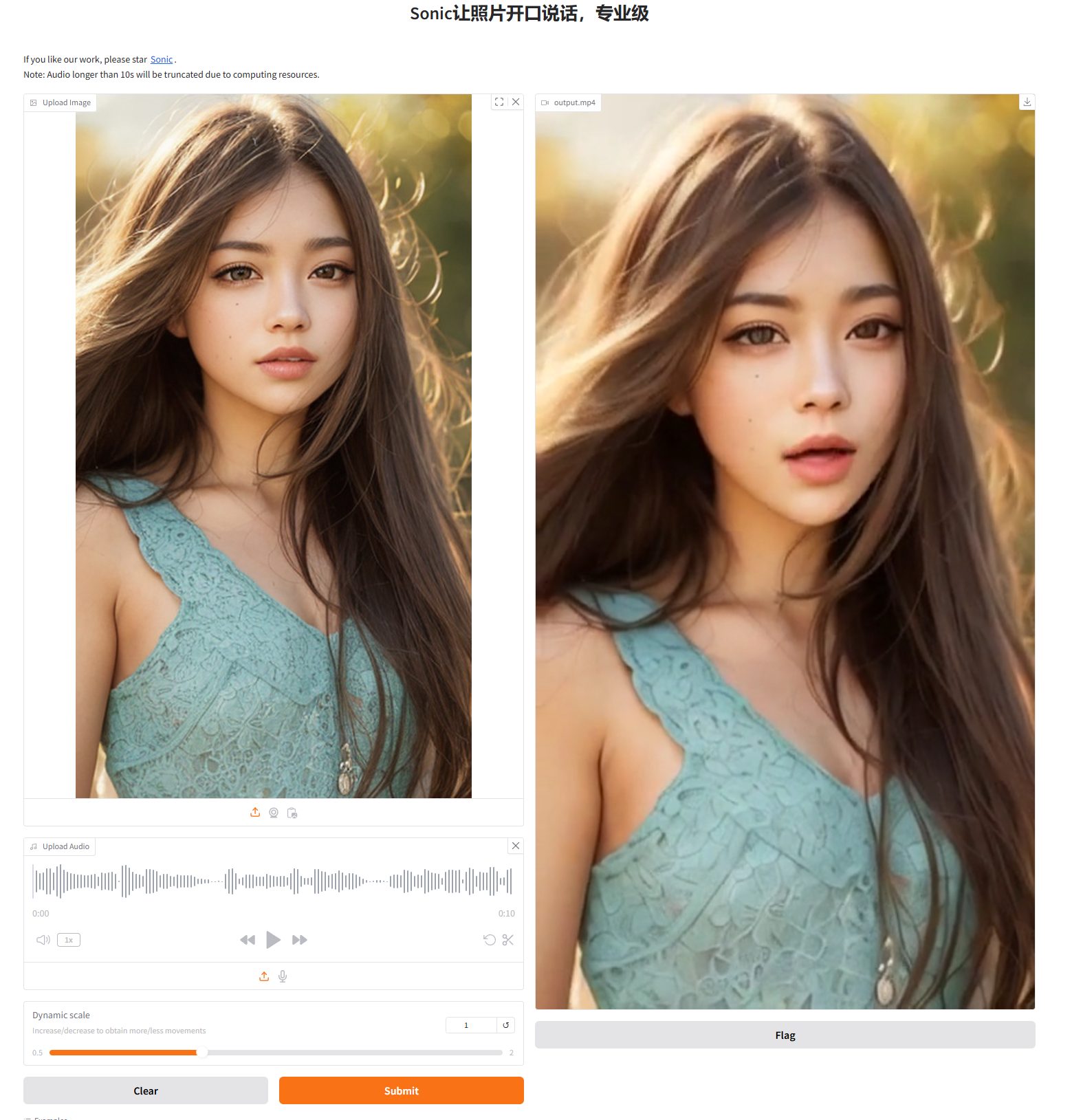 - 社交媒体吸睛神器:想在朋友圈大放异彩?Sonic 来助力。上传自己的照片和音频,它就能生成专属的肖像动画,让你在社交媒体中脱颖而出。发个自己唱歌的视频,配上可爱的肖像动画,点赞量肯定蹭蹭往上涨。